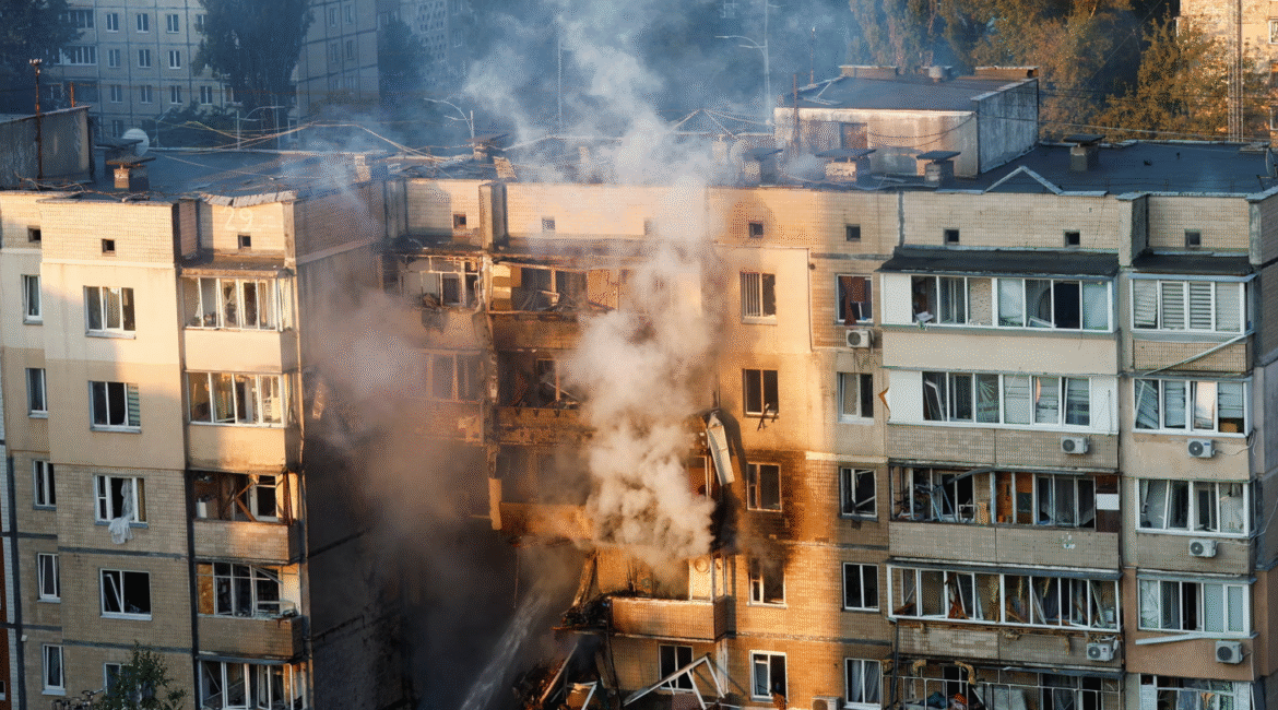 Largest Russian air attack of war sets fire to Ukrainian cabinet building and kills three